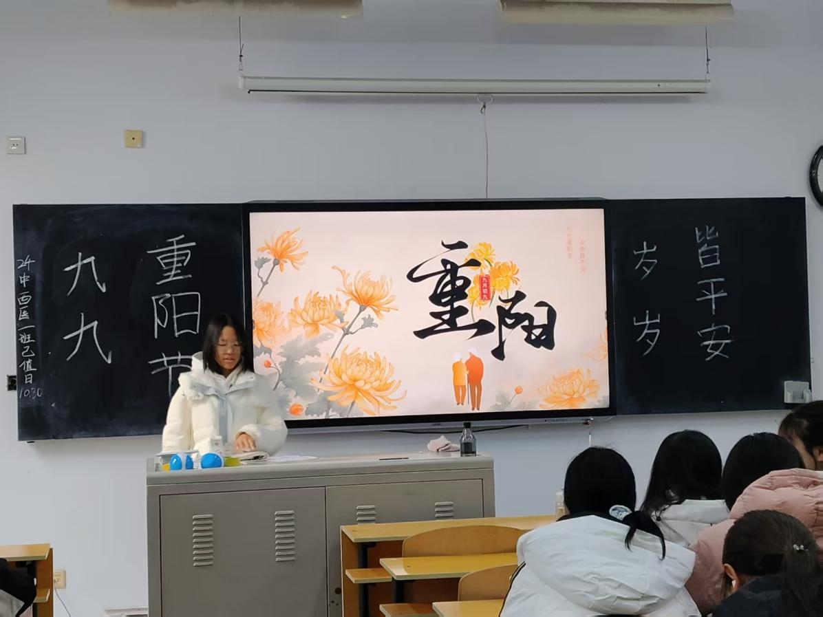 为加深同学们对重阳节传统习俗与文化精神的理解,倡导学生关爱老人,尊重长辈,培养学生感恩之心和社会责任感,传承尊老敬老的传统美德,10月31日上午十点2025级药学一班组织开展了“九九重阳节,岁岁皆平安”主题团日活动。活动由团支部书记沈雅琳同学主持。
