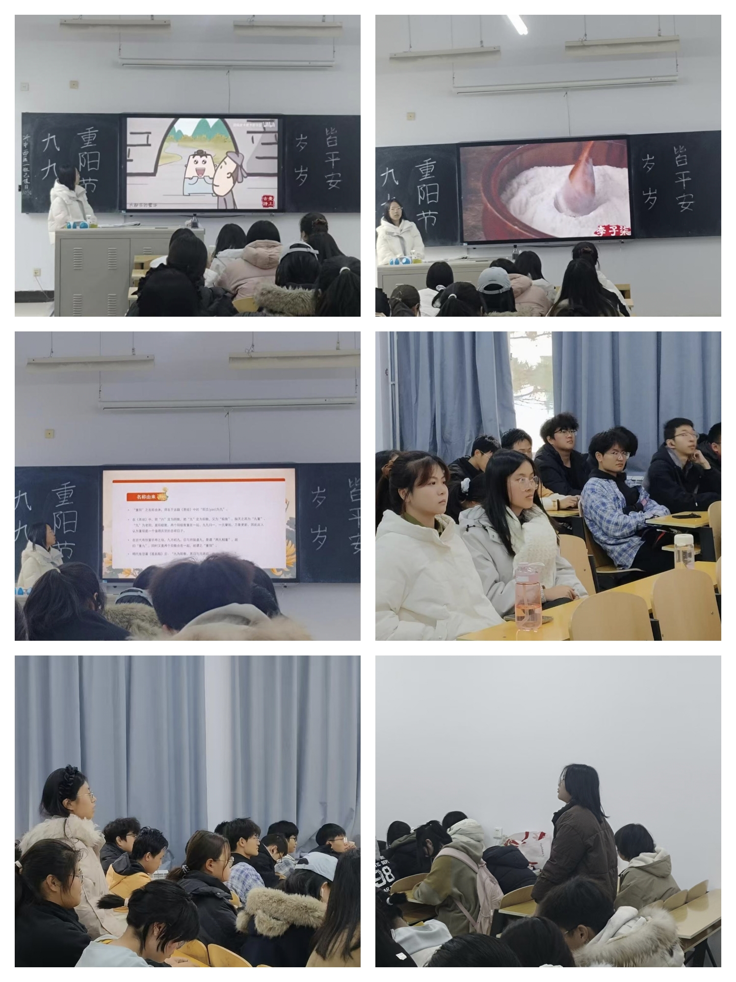 活动伊始,全体同学共同观看了重阳节主题公益广告,从中感悟敬老孝亲、感恩传承的节日内涵。随后,主持人围绕重阳节的起源、各地习俗、饮食文化、文学与传说五个方面展开讲解,并邀请同学朗读经典片段,结合生动有趣的视频展示,将登高、赏菊、佩茱萸等传统习俗娓娓道来。